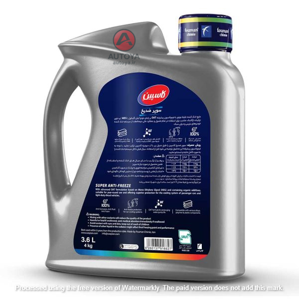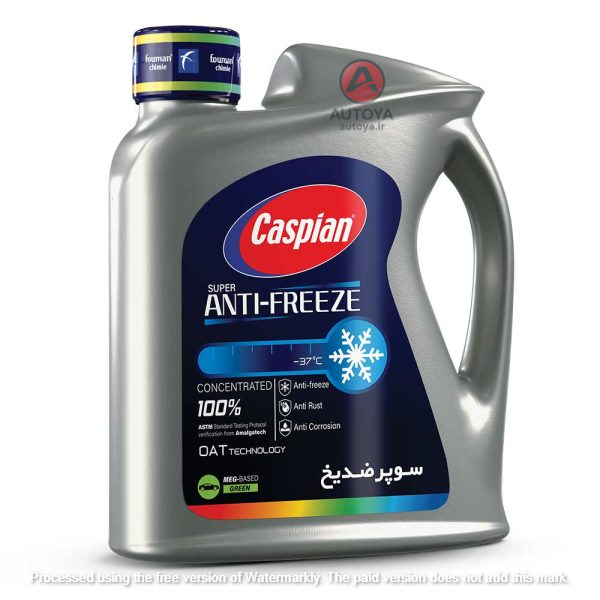 ضدیخ سوپر کاسپین مطابق با استاندارد ۳۳۸ ایران و با فناوری OAT در حداکثر سازگاری با فناوری موتورها و با آبوهوای ایران فرموله شده است و در محدوده دمایی ۳۷- درجه سانتیگراد تا ۱۱۲+ سانتیگراد قابل استفاده است. این ضدیخ غلیظ میباشد و برای دستیابی به مناسبترین محدوده دمایی باید مطابق با جدول مندرج بر روی لیبل ضدیخ با آب دییونیزه (آب رادیاتور کاسپین) و یا آب مقطر رقیق شود.